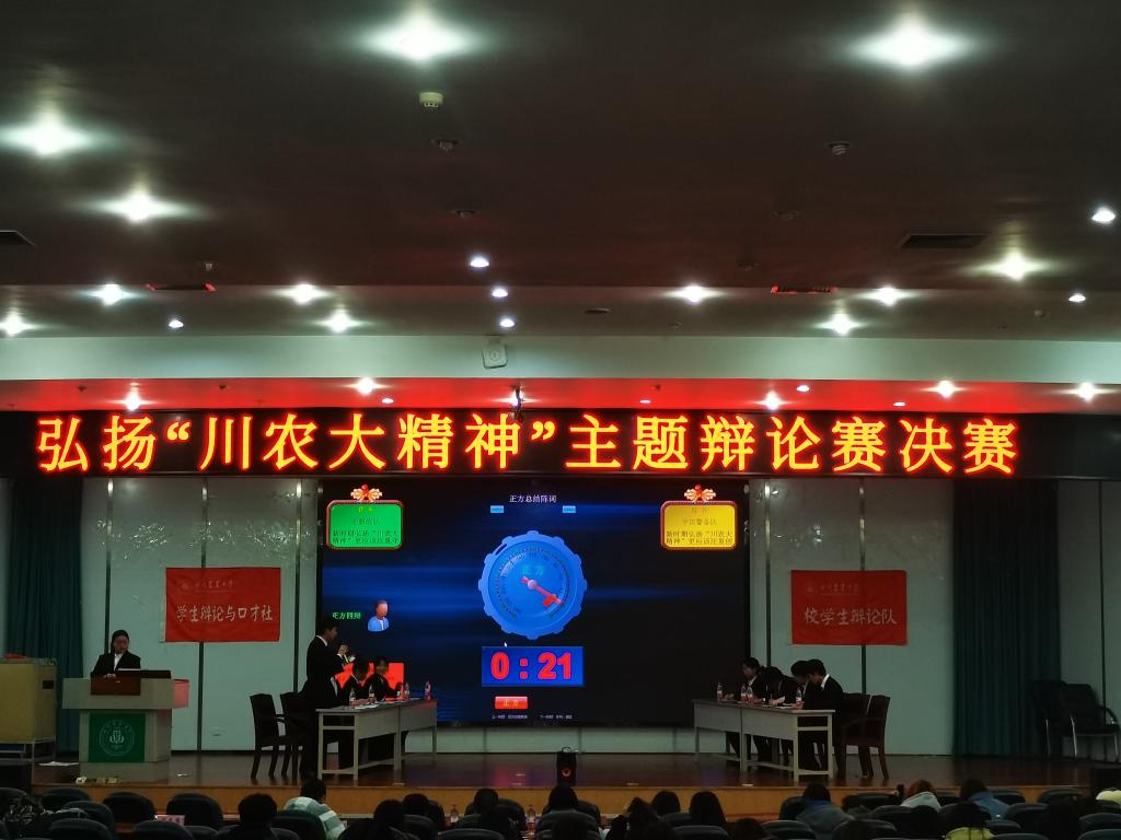 近日,由校党委宣传部、校团委主办,学生社团管理与服务中心承办,学生辩论与口才社承办的弘扬“川农大精神”新生主题辩论赛决赛于十教二楼小礼堂举行。校党委宣传部、校团委、人文学院等相关单位老师担任比赛评委,线上线下200余名观众聆听比赛。