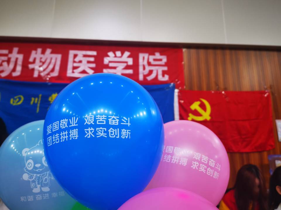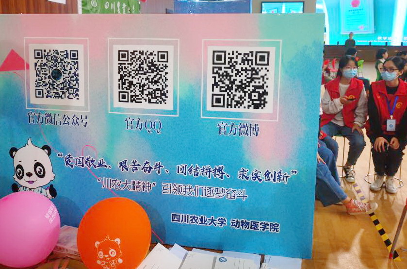 走进动医学院的迎新点,会首先看见飘在空中五彩斑斓的气球。这每一个气球上都印上了“爱国敬业、艰苦奋斗、团结拼搏、求实创新”的“川农大精神”的十六字核心内容,每一位2020级动医学院新生都会获赠一个自己喜欢颜色的气球,并有学院志愿者告诉新生“这上边印制的就是咱们的川农大精神,这是伴随你整个大学生活甚至一生的川农品质哟”。不仅如此,在今年动医赠送给你家长联络卡上,也特别加持了“传承‘川农大精神’,共建‘和谐、奋进、幸福’动医”的宣传语,还设计了微信二维码,能直接扫码联通学校“川农大精神”专题网,迎新志愿者会引导新生和新生家长通过专题网深度了解川农的文化基因和川农人的精神品质,从而真正爱上自己的母校。