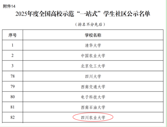 自2020年我校开启“思政一条街”建设以来,多年来融合育人场域,先后建设了鱼凫街、惠民祉、梧桐苑等9个社区,成立了3个学生社区功能性党支部,组建“一站式”学生社区建设服务中心等3个校级学生组织,设置“三长”(楼长、楼层长、宿舍长)管理助理岗,健全“校区-社区-楼栋-寝室”四级网格社区安全机制,强化学生自我教育、自我管理、自我服务,建设党风纯、作风正、校风实、教风严、学风好的育人环境,构建了独具川农大特色的“1+1+5”特色“一站式”学生社区,即:弘扬一种精神(“川农大精神”),贯穿一条主线(围绕服务乡村振兴、打造更高水平“天府粮仓”等重大需求,培养知农爱农新型人才为育人主线),实施社区五大“育人工程”(兴农先锋党建育人工程、学风培优育人工程、积健图强育人工程、校本文化育人工程、耕读实践育人工程)。