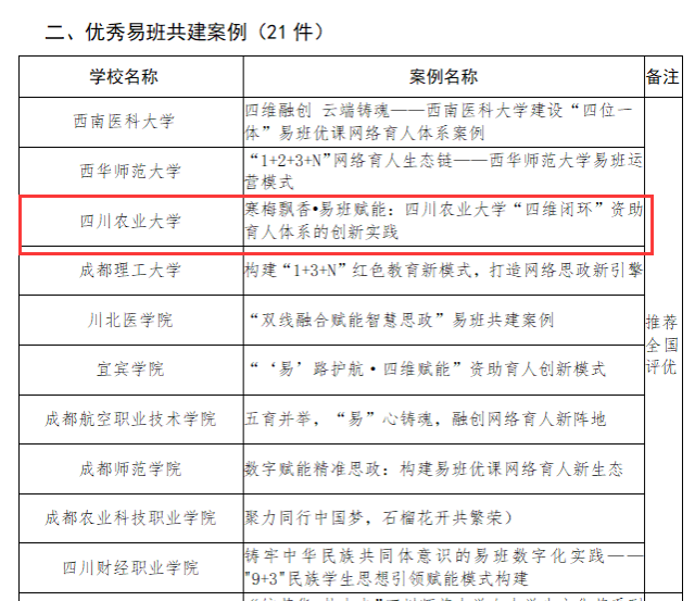 4月7日,四川省教育厅易班建设与发展中心公布了2024年度四川省易班共建高校评优结果,我校获“优秀易班共建高校”“优秀易班共建案例”“优秀易班辅导员”三项荣誉。
