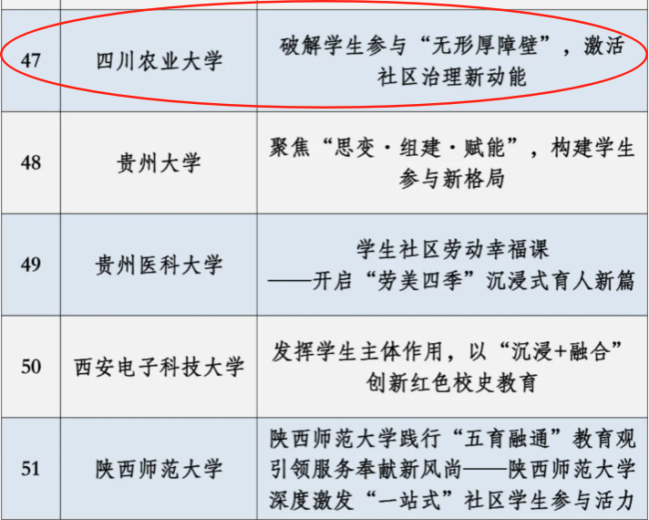 目前,获评的优秀项目已纳入全国高校思想政治工作网资源库,并在“一站式”学生社区综合管理模式建设工作云平台和高校思政网微信公众号进行集中展示。学校将进一步深化“三全育人”综合改革,协同推进“立德树人”机制综合改革试点,持续完善“一站式”学生社区建设,不断提升社区育人实效,为培养知农爱农的新型人才提供坚实支撑。