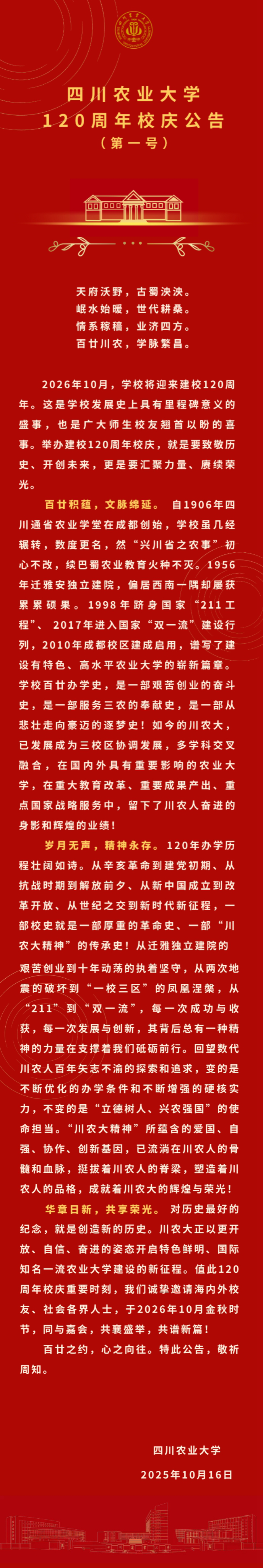 四川农业大学120周年校庆公告(第一号)