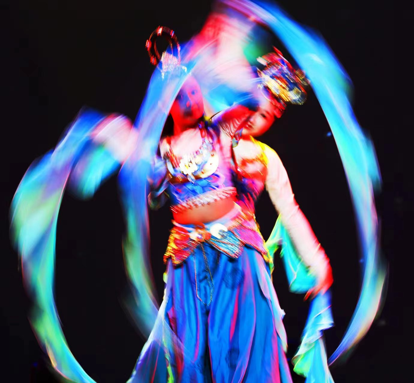 整场演出聚焦于我国文物流失问题,将身处异乡文物的思乡之情娓娓道来。“西北望长安,可怜无数山”,演出伊始第一篇章“梦·古韵”便紧紧吸引观众们的目光。古典舞《清风徐来》以清代《执扇就座仕女图》为创作蓝本,通过女子手持团扇的人物形象表现少女的温婉与灵动;胡旋双人舞《对影胡璇》将观众带入热情神秘的辽阔西域;傣族舞蹈《竹林掠影》,生动地表现出傣家姑娘在茂密的竹林中轻盈起舞的情景。海阳秧歌《溯跃》选取“鱼”的形象,同构“跃”的意象,寄语青年们踏沧浪而歌,逆流而上。