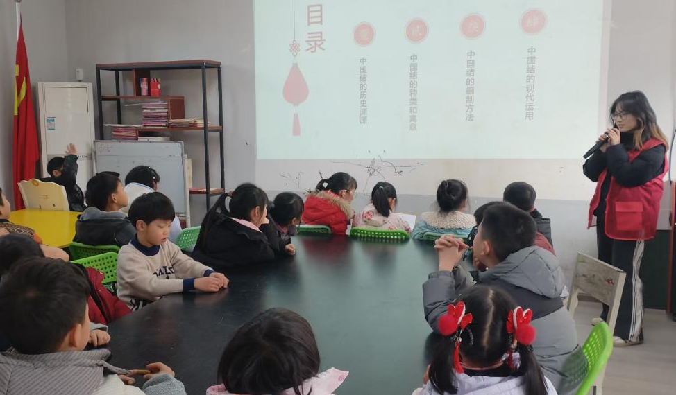 (图为志愿者为小朋友讲解中国结制作方法)